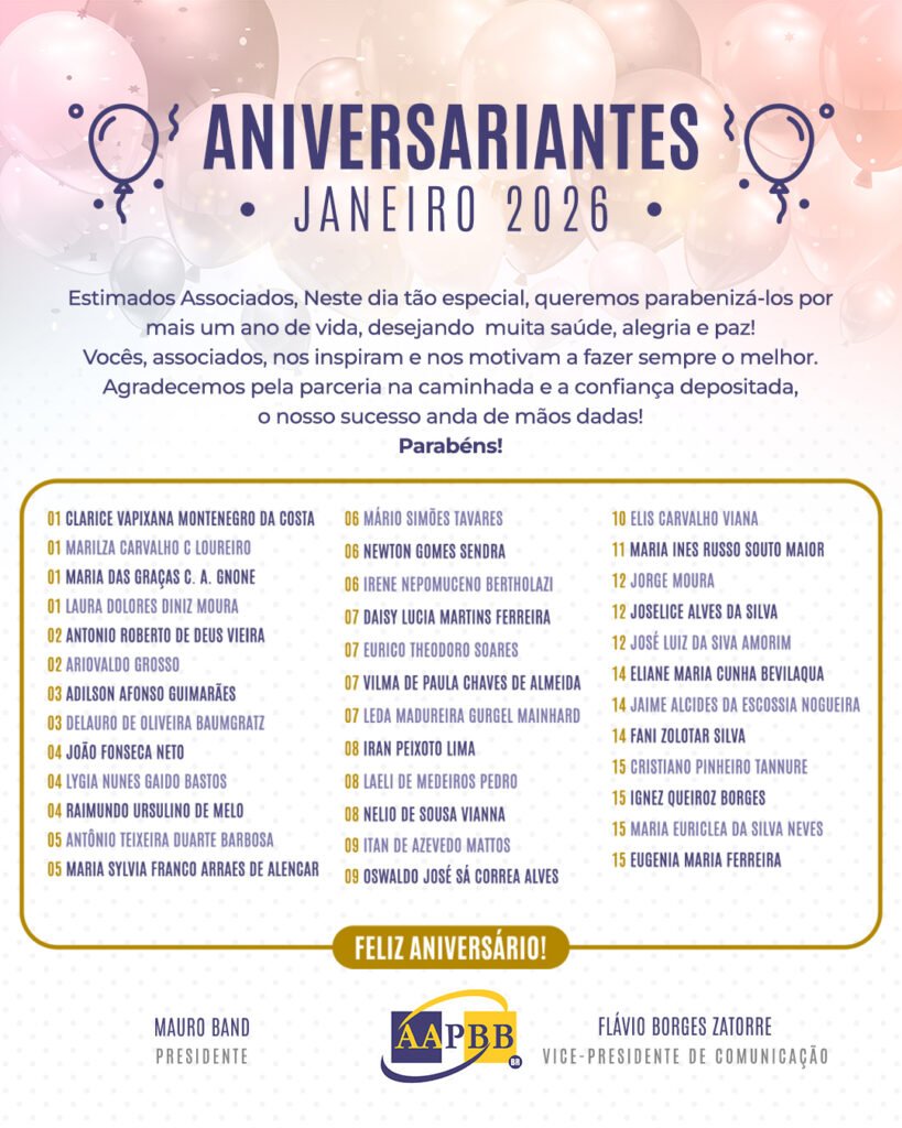 Aniversariantes de Janeiro: 01 a 15/01/2025