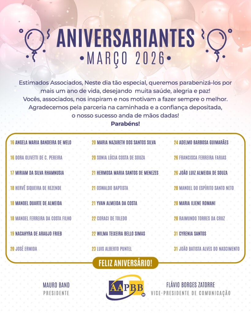 Aniversariantes de Março: 16 a 31/03/2026
