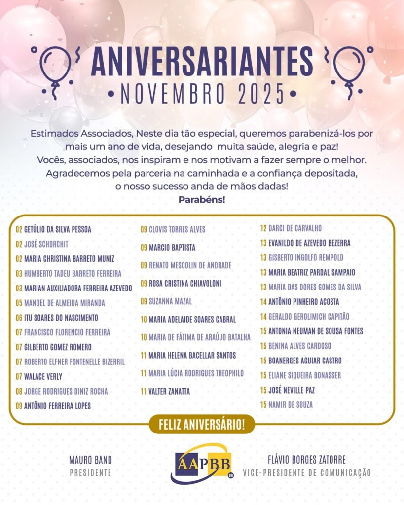 Aniversariantes de Novembro: 01 a 15/11/2025