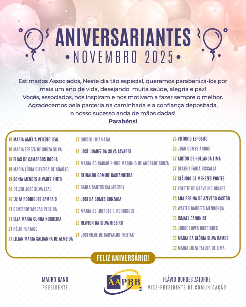 Aniversariantes de Novembro: 16 a 30/11/2025