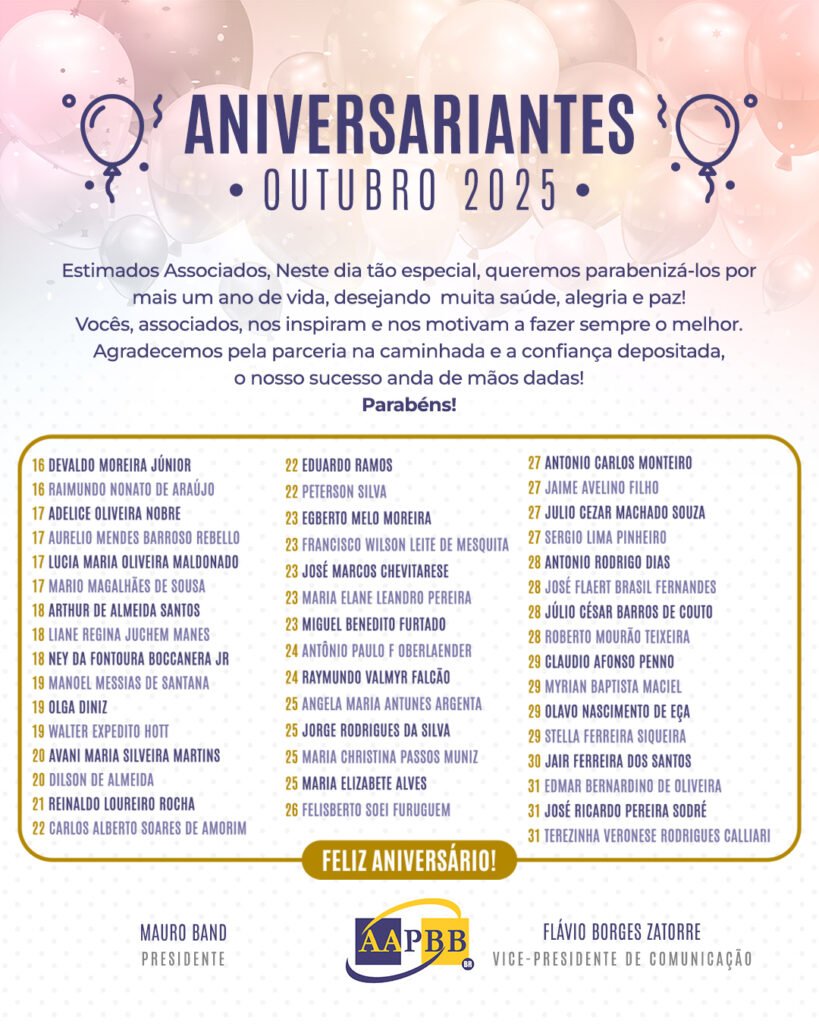 Aniversariantes de Outubro: 16 a 31/10/2025